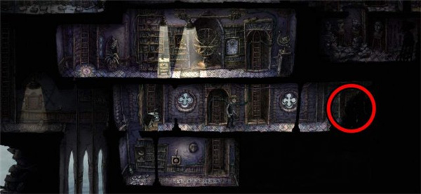 8、顶层前往红圈处放下右侧吊桥,之后往右走到狗子面前勾引狗子,被狗子追着到达黄圈上去,蓝圈上面点有一个白点,是开关,打开开关会发现狗子变成了矮柜。之后下楼把狗子移动到右边粉圈断掉的梯子这里,上梯子,从进入的房间右边的长梯一路向下爬,完成关卡。