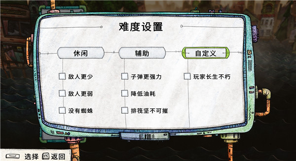 7、点击难度设置,玩家如果想要让游戏更轻松一点的话,可以自己设置降低油耗、子弹更强、角色长生不朽等等