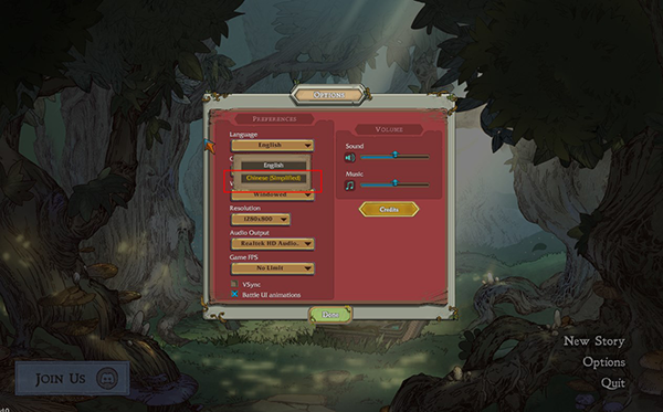 3、进入设置界面,在这里可设置语言为简体中文,同时还可调节音量、音效、分辨率等