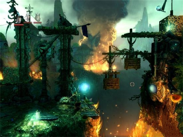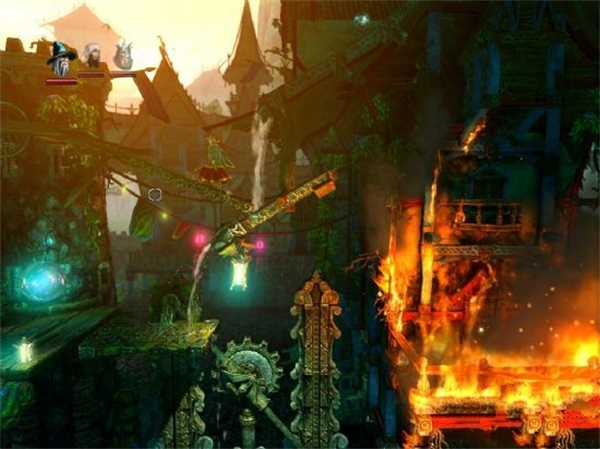 5、之前的铁石不要浪费了,这一场景一共有两个铁石,不用吝啬直接过了场景的第一个坑里丢下去,两个铁石叠在一起下去捡东西的时候就不会被底下的火烧到。然后利用弓箭手的绳索获取下方的药水。木栅栏的障碍可以切换战士用锤头砸碎。另外一边,最底下中间有两瓶药水,先从缺口跳到中间层,然后变成魔法师,随便召唤一个物体,利用物体从最底下靠近火的地方移动过去可以直接将障碍撞开,应该也可以直接用念力操控挡着的木板。失去了阻挡物,在弓箭手跳下火海前用绳索连上第二层的地板,荡秋千的方式就可以取得这里的圣水瓶和药水了。