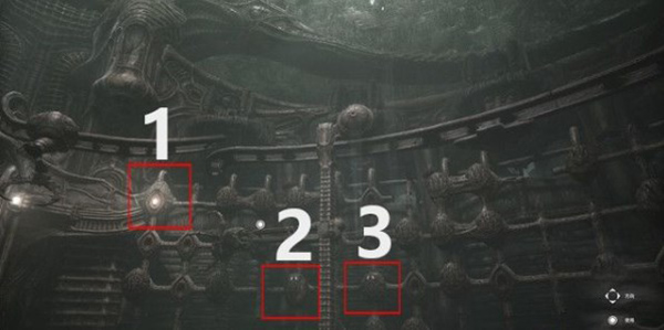 这个地方有两个控制台,右侧的控制台可以控制网状硬壳卵,左边的控制台可以控制一个小型的运输升降台。你需要完成这里的解谜,把图片中位置2和位置3的两颗有生命体征的硬壳卵,运送至位置1处。先运送位置2的硬壳卵,你将发现那颗卵是颗死卵,最后再运送位置3的硬壳卵,不过想要把它运送到位置1,你可能需要折腾很长时间。