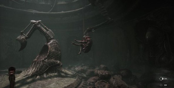 接下来打开它身下的控制台,并前往它身后的骨堆尽头,同样的与那里的控制台互动,一个大夹子将吊走另外一块生物电池。