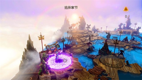 1、一开始处于的是章节选择场景当中,章节是以圆盘来显示,只要玩家 控制角色走到紫色高亮的圆盘上(这就表示这章节已被解锁)就可以进行该章节 的游戏。