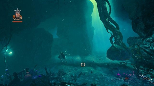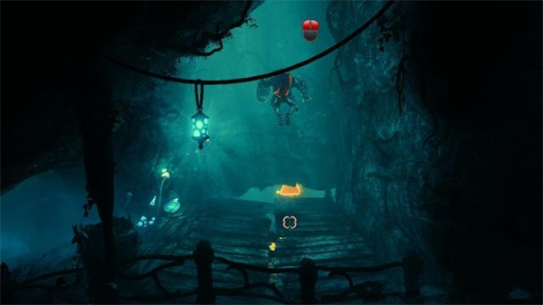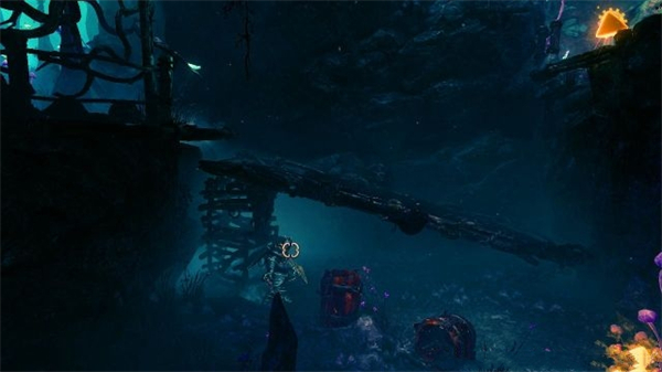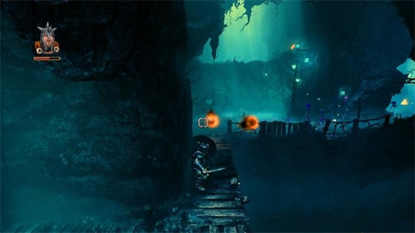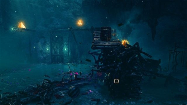 6、进入到幽暗的山洞内,去到右侧发现地板有一道大木门,跳高后同时 按着鼠标左键和鼠标右键使用庞提乌斯的下坠践踏攻击打破。