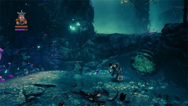 7、接着的场景中有一个石头被树根给缠住而悬吊在空中,在地面上同时 按着鼠标左键和鼠标右键再配合方向键,可以发动庞提乌斯的冲撞技能,让这悬 吊的石头撞破东面北面的岩壁,可以搜刮到当中的金三角。