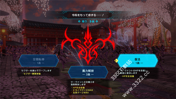 而且原本只能使用三次的令咒,都会在每次出击时再度补充,可无需顾虑尽情使用。以令咒下达命令将战局导向有利的局面!