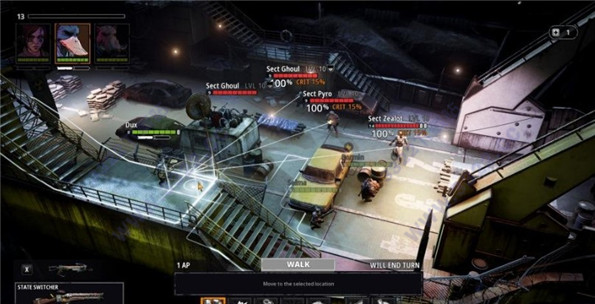 2、在探索过程中分为正常行走与潜行两种。如果你大摇大摆的开着手电靠近敌人的话,那么就会丧失先手伏击的大好机会。进入战斗后,玩家一回合的行动同样分为两块——移动和动作。