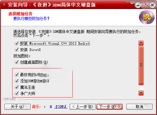 3、这里是选择游戏的安装组件,上面两个是游戏安装必备的组件,而最下面的四个选项与游戏启动无关,可以取消选勾。