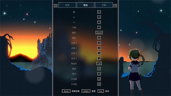 上/下/左/右:↑/↓←/→跳跃:Space翻浪:c武器1:Z武器2:X法术1:A法术2:S物品栏:Tab地图:M排序:V