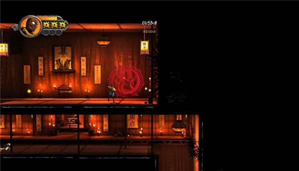 关卡内有各种陷阱,如图中地上红色的刀刃。还有各类珠子、黑字等加分物品,如图中左上黄色的大型珠子。除此之外,还有各类敌人等待着玩家。Kuro需要利用不同的操作和攻击技巧打击他们。例如远处守卫的敌人,就可以用手里剑先行消灭。珠子在关卡各处都有,一般小型珠子都在行进的道路旁。大型珠子和黑字则需要一些跳跃技巧进入相对隐蔽的区域获得。关卡中还有各类障碍需要破除。的隔板就需要冲刺攻击打碎才能前进。通关所用时间也是游戏的重要评定因素。因此除了操作熟练,还需要简化操作。下方的敌人就可以利用跳跃冲击攻击,同时吃到沿途的珠子。红色的脸谱就是存档位置。死亡后会在最新的存档位置复活。死亡是会降低评价得分的。最后,玩家会来到一个巨大的红色龙纹位置。这就是通关位置,接近龙纹就会通关了。通关后就是显示评价。用时越少,杀怪越多,获得珠子和黑字越全,得分越高。再扣除死亡罚分就是总评价分了,笔者手残,第一次只得了个B。不过都可以反复挑战,关卡结构和怪物位置会很快摸清,得A也不是难事,看你的了。游戏评价