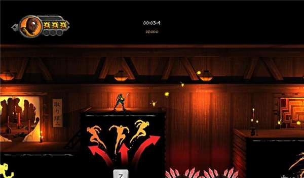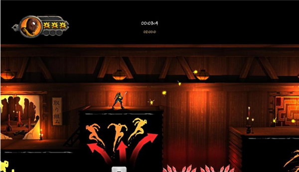 故事模式就是通常的过关流程,有简单剧情。挑战模式则是在不同的地图上完成通关任务。挑战模式有多样的地图可以选择,你还可以自己用地图编辑器制作。每个挑战都会显示你所用的时间,你要做的就是不断刷新这个时间。故事模式则有7个关卡,每个关卡设置3个难度。完成上一关卡解锁下一个关卡。完成低级难度解锁高级难度。2、游戏/操作技巧空中按冲刺键可以额外冲刺一段距离。这个技巧很有用,许多地方需要空中冲刺才能到达。向上或向下冲击的过程中攻击会引发特别攻击效果。这个效果很具有观赏性和实用性。在冲刺过程中按攻击会引发强力攻击。空中冲刺如果遭遇目标同样会进行强力攻击。空中时按下并攻击目标会触发斩杀攻击。铁拳是强力的敌人,要小心应付。对付他最好的办法就是利用移动效果进行强力攻击。或者想法到其背后给予致命打击。离敌人有一定距离的攻击会引发牵引效果。主角会把敌人拉过来攻击。利用手里剑攻击远程敌人。手里剑使用后会缓慢恢复。当主角跑向敌人时,会有短暂的时间忍者刀会闪光。这时攻击会触发移动攻击效果,攻击力更强。上面提到的对付铁拳就是用这招。通关评价取决于收集黑字、珠子还有杀死敌人以及所用时间。当附着于墙面时,按上下键可以缓慢滑动。背后攻击会引发强力的背刺效果。观察敌人的攻击方式,利用跳跃躲闪。在空中冲刺快速接近敌人并了结他。空中按下并按跳可以向下直接冲击。附着于墙面时利用上一招同样可以快速降到底。空中冲刺到墙面时,按住冲刺键不放。这时就能接着跑酷上墙了。游戏攻略