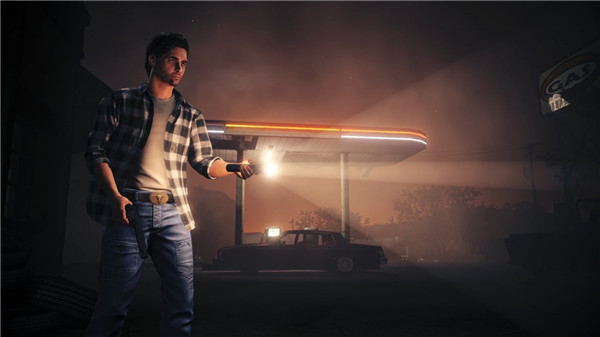 游戏开始后可以找到手电,使用手电消灭挡路的黑暗力量后继续前进可以得到9毫米手枪,游戏中黑暗力量能令你受伤,光明则能给予治疗;玩家在游戏中对抗黑暗不慎受伤时,可以待在光明的「安全处」,治疗战斗时损耗的血量。面对被黑暗力量附身的敌人时,朝着敌人按住手电键燃尽黑暗,并搭配手枪射击敌人。当手电筒的电力耗尽时,还可按下Q键进行更换电池,不过手电筒的电力会自动补充,如遇到紧急的情况再更换即可。消灭挡路的两个敌人后来到油田,在这里遭遇 大量敌人,单凭一把小手枪无力对付数量众多的敌人,在这种情况下我们就是实行战略撤退政策,shift为冲刺,一路跑到汽车旅店的光亮地带即可。游戏中的武器箱需要用原稿才能解锁(原稿在小图上现实为问号标志),关于原稿的收集笔者会另写一篇攻略,本篇攻略则专攻主线流程,在车库(车库旁有电池与弹药补给箱,右侧货架上有一把射钉枪)里找到艾玛妹子,妹子告诉我们有一个长的和艾伦一模一样的家伙在这里横行霸道,为了洗清艾伦的嫌疑必须找到三件物品回到油田重写现实。关于物品位置会在屏幕左上角小地图现实为黄色五角星标志,去这些地方仔细寻找即可找到任务物品,第一件物品是电池,从汽车旅馆出来后向右侧前进可以发现两辆卡车,在左侧蓝色的卡车上会找到电池,注意这里会有三名敌人招呼艾伦,消灭它后继续前进,在吉普车处可以找到大量补给。下一件物品是旋转手柄,来到地点后广告牌会砸下来,不过幸好我们的主角没事,这里依然会有三名敌人出现,把他们送回老家后拿取地上的旋转手柄即可。最后一件物品为CD,来到这所房子附近后会从里面冲出两名敌人,这种敌人会把自己一分为二躲避光的攻击,虽然数量上多了,但同时也更脆弱了,点燃一根火炬之后可以轻松将他们送回老家,之后进屋在桌子上找到CD,同时还可以找到一把卡宾枪。三件物品全部找全后就要去油田重写现实了,注意在这座小屋的台阶上可以找到一把霰弹枪与弹药补给。油田处有大量敌人埋伏,使用霰弹枪与信号火炬的配合可以迅速将他们秒杀。之后查看原稿,找到重写现实的线索:转轮就位了,原油在流淌,电池已安装,灯光在闪烁,唱片还在播放机里放着歌,根据这个线索,将CD放入播放器,将转轮安放在油井上,将电池放在警告器上之后打开警告灯,随后触发剧情,卫星直接坠落到油田引发巨大的爆炸,一路躲避爆炸与火焰返回艾玛所在的车库。来到车库后发现这里已经被黑暗力量所包围,消灭砸门的两个敌人后又会出现三名敌人,其中有一名胖子敌人和一个移动迅速的敌人,切忌只专注攻击一位敌人,因为敌人会绕到玩家的背后并躲到暗处伺机而动。建议搭配闪避技巧(SHIFT键),在最适当的位置时再进行攻击,敌暗我明的战况强攻并不是上策。 消灭全部敌人后进入车库与妹子对话可以得到餐厅的钥匙,去餐厅之前韦克告诉艾玛赶快离开这个是非之地,还有一定要待在有光的地方,不过妹子好像并不买账。来到餐厅附近后会触发剧情,黑暗力量控制餐厅上的巨型广告标识对韦克进行疯狂攻击,不用理会直接冲刺到餐厅门后使用钥匙打开大门进入餐厅即可。餐厅也破坏的一片狼藉,在右侧地板上找到汽车旅馆的钥匙,在返回旅馆的同时会遭遇大量敌人连同之前那个广告牌的攻击,使用信号火炬拖延敌人,直接跑回汽车旅馆即可,不过不听韦克劝告的艾玛妹子妥妥的杯具了。使用钥匙打开正对着车库那间旅馆的房门可以发现米歇尔法拉比的尸体和一串钥匙,从挂在墙上的制服来看他在天文台工作,拿上钥匙后韦克驱车赶往天文台。