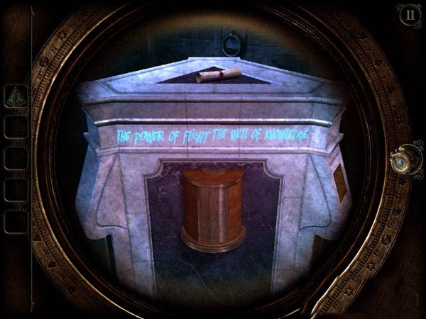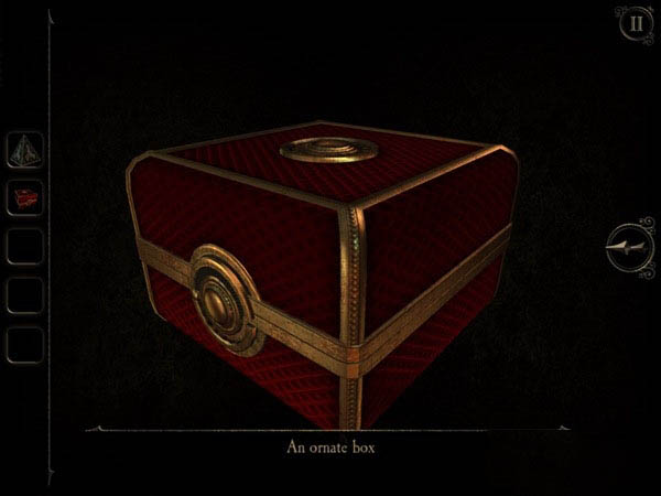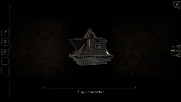 The power of flight,the well of knowledge——羽毛钢笔The poor have me,the rich need me——什么也没有My face is silent without my hands——怀表按照这个顺序,三角台的小柜就会顺利打开,在里面你可以得到一个华丽的盒子,里面是一个镜头,可以佩戴于透视镜上,帮助你解开各种谜题。