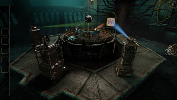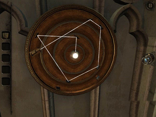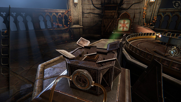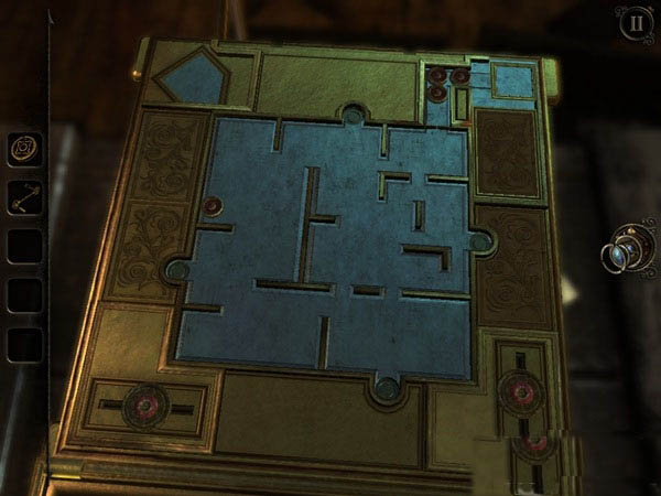 Part 3Chapter 2 的主题是修补钟楼,通过在房间的各处找到钟楼的碎片,并且将其逐一重装起来,目的只有一个,就是得到封闭于钟楼模型里的三棱体魔盒。Chapter 2 的谜题类型非常多,其中包含了我们常见的小游戏。例如钟楼模型上的迷宫棋子,玩家需要利用左边与右边的滑动开关分别控制四枚棋子的滑动方向,使其最终到达四个方位的凹陷空位上。