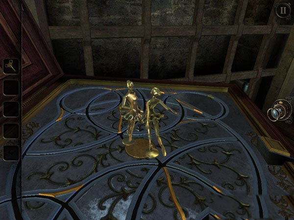 钟楼模型侧边有一个小棋盘,只要将右边一排棋子都打掉,即可获得一个金色小人;还有一个很有趣的,就是音乐盒解谜,将钟楼上获得的金色小人重装于音乐盒上并使其运动,可获得一个红色的宝石。