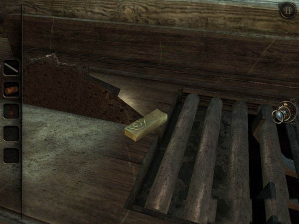 打开那扇门进入新的房间后,除了看看里面有哪些东西可以收集之外,最重要的一步是打开门右侧的一个小窗户,那是为了让刚才的沙袋穿过窗户进入到这房间里。沙袋中藏有一块金条,你必须想办法把沙袋弄破,从而得到这金条,刚好,新房间里就有一个正在启动的锯木齿轮。