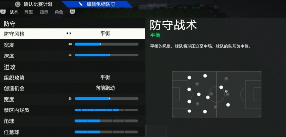 防守深度55更能发挥出3中卫防守体系的效果。进攻设置向前跑动,感觉球员更加积极,禁区人数7,这样有很多传球路线可以选择。