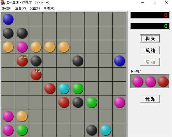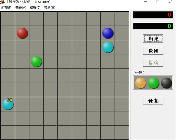 游戏中有七色彩球,玩家的目标是在N*N的方形游戏盘中,像五子棋一样将同色球五个以上连成线,横竖斜都可以。完成了彩球就会消失,并且玩家得分,连的越多分数越高,形成交叉得分更高