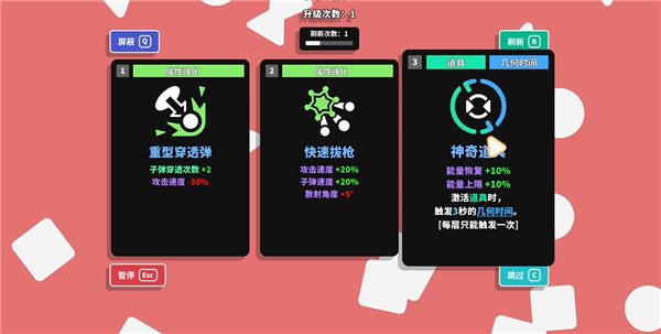 几何竞技场2(Geometry Arena 2)是一款融合了RPG与Roguelite元素的动作射击游戏,支持玩家自定义组合搭配武器、机体、模组、升级和难度选项。游戏初始提供三种职业选择,分别是士兵、突击手和炮兵,玩家需要通过提升职业技能等级以解锁更多职业,且每个职业都拥有独特的技能,这些技能在局中具有重要作用。而随着玩家在局内获得经验、提升等级后,还可获得一次属性升级的机会,你可以灵活选择属性搭配体系玩法,最终通过相应层数结数分数。