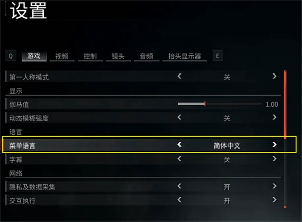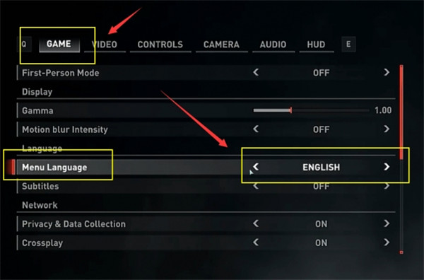 2、进入设置页面之后,选择GAME,接着选择Menu Language,调整后方的语言选项。