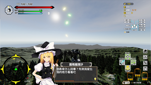 通过操纵魔理沙, 玩家们可以在幻想乡的上空自由的飞翔。通过三维视角,我们可以体验到非同寻常的立体弹幕攻击