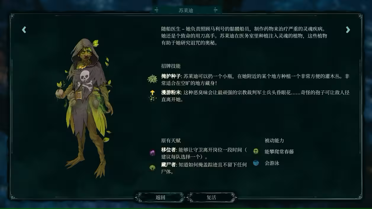 随船医生,她负贵照顾马利号的骷髅船员,制作药物来治疗严重的灵魂疾病。她还是个致命的用刀高手。苏莱迪在医务室里种植注入灵魂的植物,这些植物有助于她研究诅咒的奥秘。