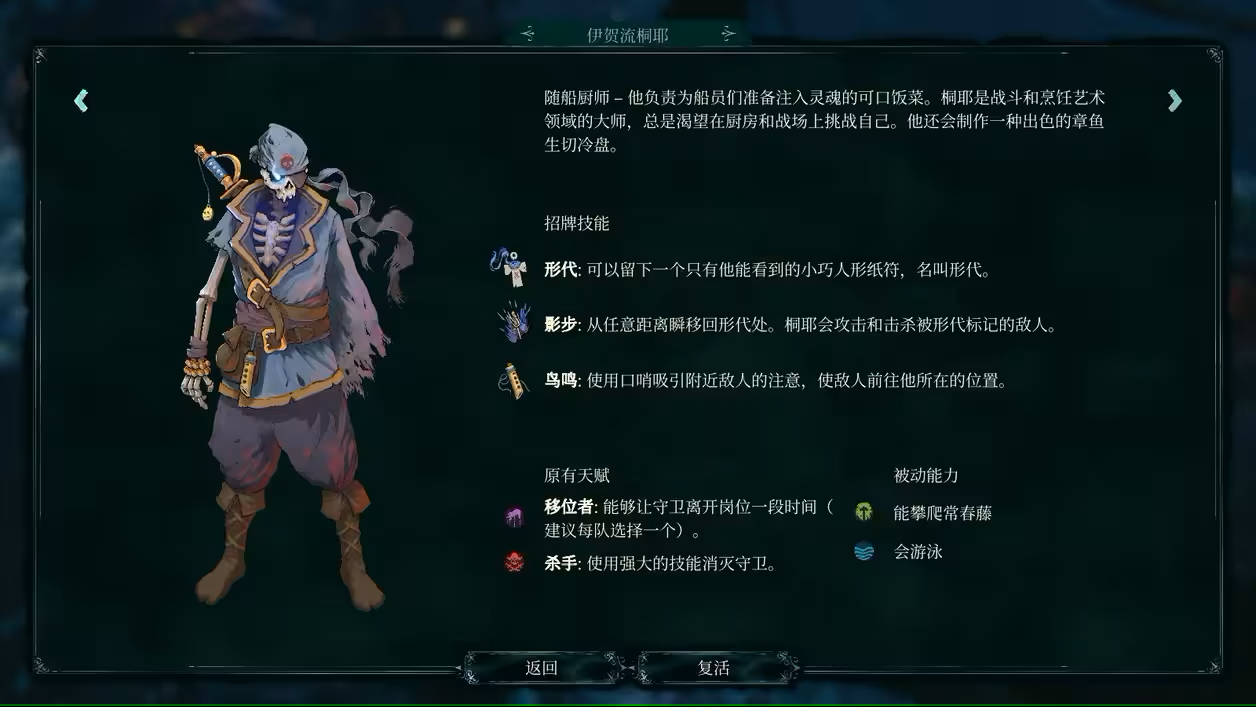 瞬闪:除了击杀敌人外,也可以通过此技能进行瞬间移动(移动范围8、噪音半径5.5)受视线限制、受物体阻挡,技能升级后范围更大且不受阻挡,但使用次数受限。