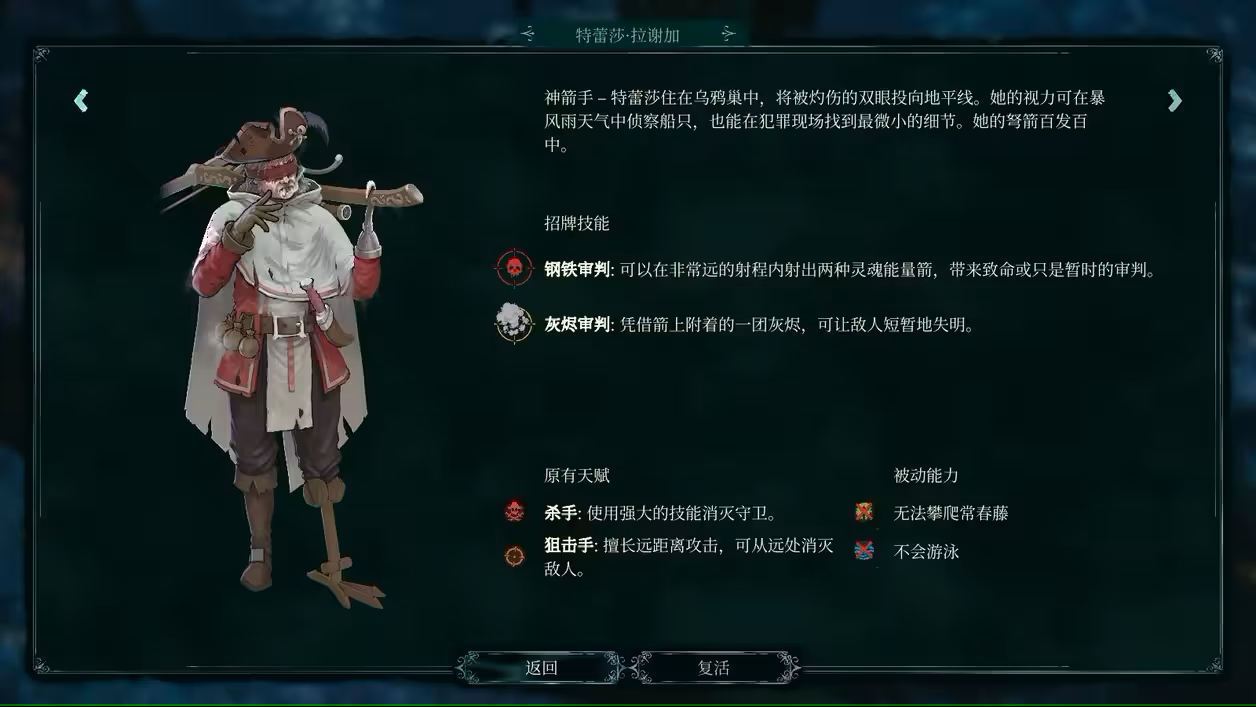 神箭手—特蕾莎住在乌鸦巢中,将被灼伤的双眼投向地平线。她的视力可在暴风雨天气中侦察船只,也能在犯罪现场找到最微小的细节。她的弩箭百发百中。