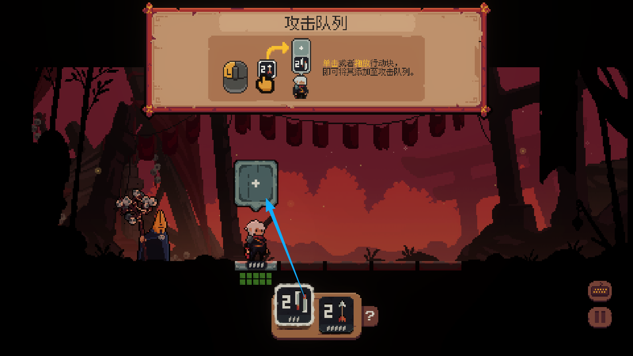 2、将下方的攻击卡牌长按拖拽到人物头顶,再点击鼠标左键或者键盘空格就可以释放攻击了,放技能和释放技能都需要一回合。