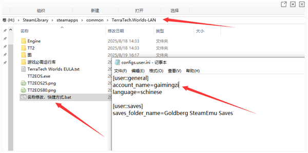 双击打开游戏目录下面的“名称修改,快捷方式.bat”,找到“account_name=gaimingzi”,把“gaimingzi”改成自己想要的名字保存。