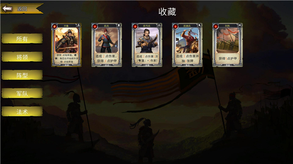 将领:每当获得1点指挥值,抽2张牌)、援军(在抽牌库抽1张军队牌)、重整旗鼓(在弃牌堆抽2张军队牌)、轻装骑兵(获得1点指挥值、抽一张牌)、青州轻骑兵(抽1张牌,获得该牌费用相等的指挥值)以及非常关键的“陷阵虎位”(不能被打出,弃牌是+20防御,并对所有敌人造成10点伤害)