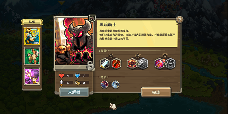 黑暗骑士是黑暗军的支柱。他们以生命力为代价,换取了强大的邪恶力量,并依靠厚重的盔甲来弥补自己体质上的不足。