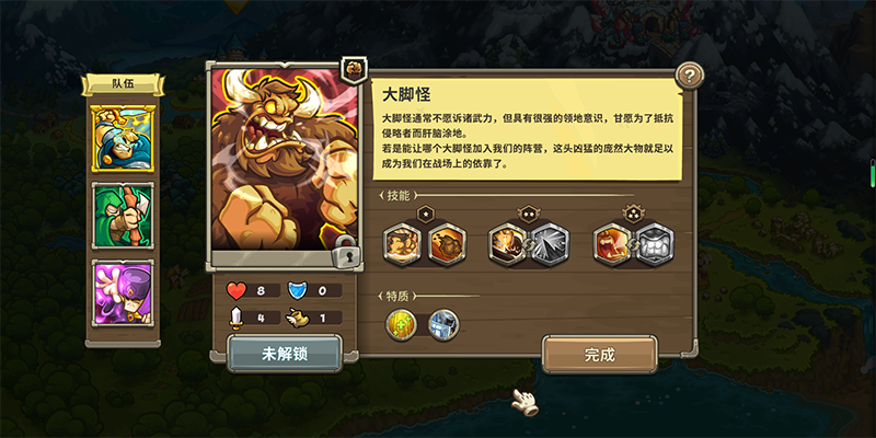 大脚怪通常不感诉诸武力,但具有很强的领地意识,甘愿为了抵抗侵略者而肝脑涂地。若是能让哪个大脚怪加入我们的阵营,这头凶猛的庞然大物就足以成为我们在战场上的依靠了。
