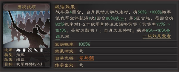 二、配合防守阵容打防守反击。通过搭配如八门金锁阵、藤甲兵等类型的战法,减少前期兵损,自身拥有的攻心效果可以维持自身续航,当到达第五回合后,司马懿由防守转为进攻,自身及其优秀的指挥战法输出,其场均输出:0.8*(1*1.54+2*1.54)/2=1.848比有火的风助火势输出还要高,而且指挥战法不惧怕控制,输出能力十分强大。但是该阵容如果前期不能顶住敌方输出,就会全面崩盘。