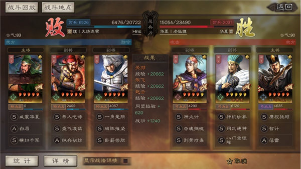 综上:虽然关羽队战法一直都有触发,但是八门金锁阵给司马懿的先攻,让司马懿前期几次关键智计和八门金锁阵一起有效的降低前期的战损。配合周瑜自身的输出,周瑜在输出时也可以凭借刮骨疗毒治疗友军,最终略胜一筹。