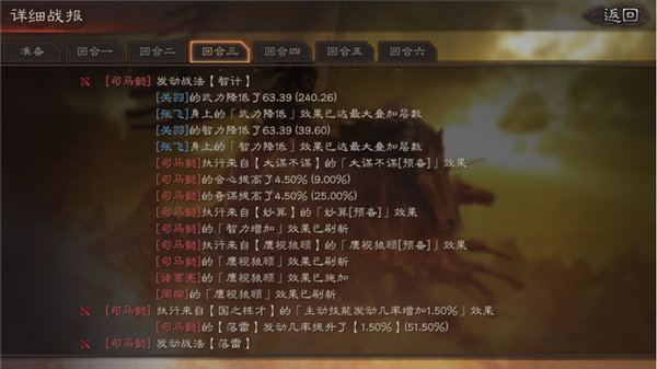 首先司马懿靠着八门金锁阵占到了先攻,使用战法智计降低了敌方两人61.44点武力、智力,并且触发了鹰视狼顾效果。