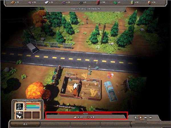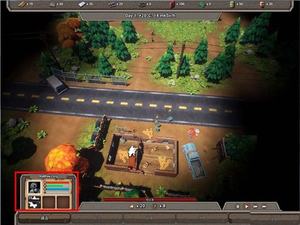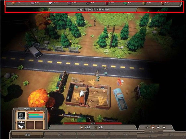 二、界面1、如下图红框,这里显示的是所有的资源和游戏天数、温度,资源很好理解,天数和温度的意思就是,随着天数的增加,你将会遇到更强的敌人,例如,最开始的几天,掠夺者只会拿小手枪,极少数会刷到冲锋枪,僵尸也很弱,速度很慢,但是到了40-50天,掠夺者会拿突击步枪,僵尸很强,会刷一些移动速度很快的僵尸,而且其他据点的人也会组队来袭击。而温度需要注意,当温度达到5度左右,这就意味着要进入冬天,需要做好准备。