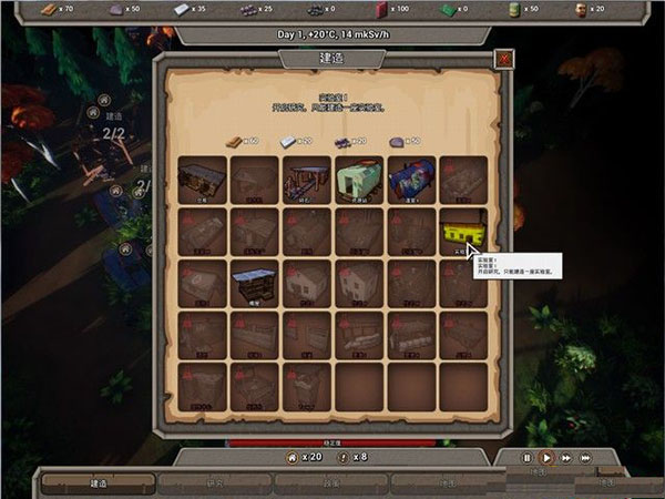 三、建造在界面的左下角就是建造按钮,这里可以选择一个建筑进行建造。如果要建造一个建造,必须满足两个条件:材料足够、科技已经解锁。必须合理安排资源才能保证正常玩下去,具体的操作,可以参考攻略后面的部分。