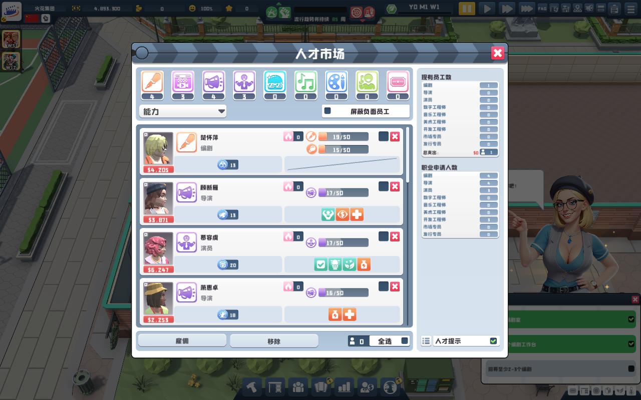 招募顶尖影视人才,打造你的梦幻团队!从天才编剧到王牌导演,从资深场务到特效专家,精心配置每个岗位的人力资源。用专业的人力管理,为你的电影王国注入源源不断的创造力!