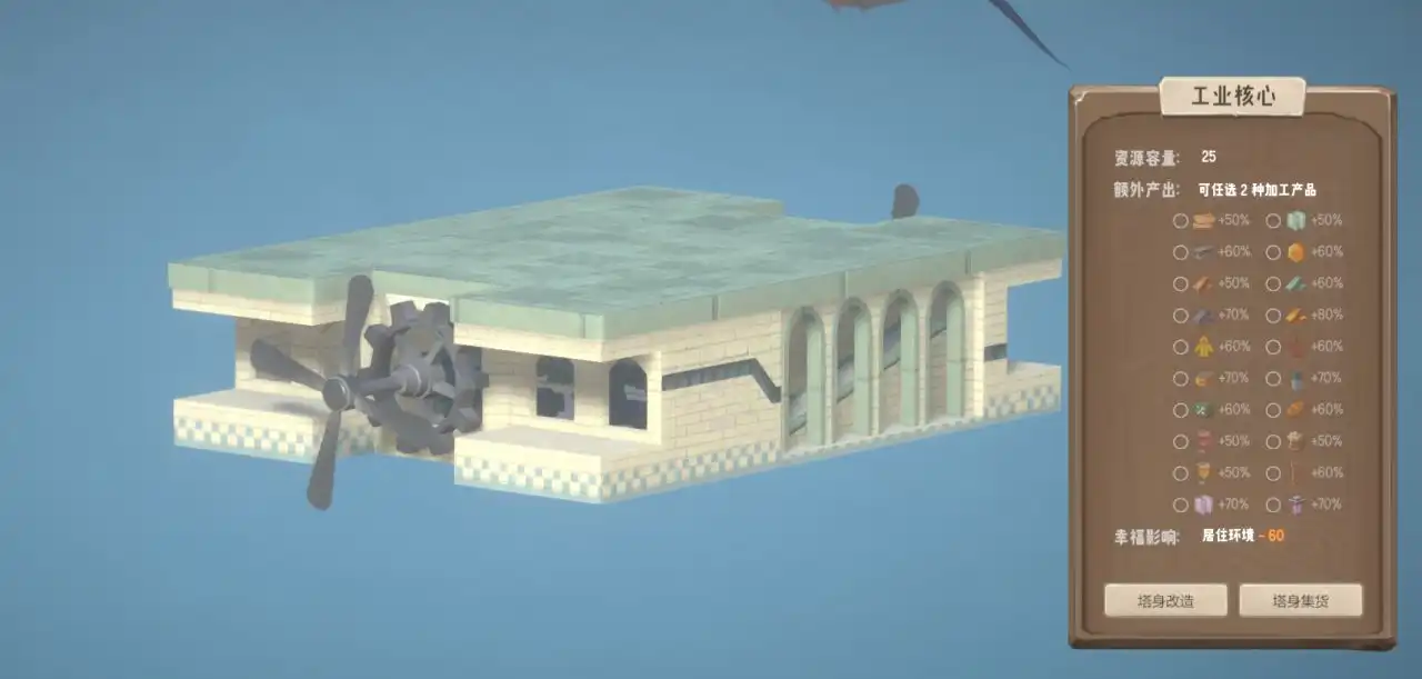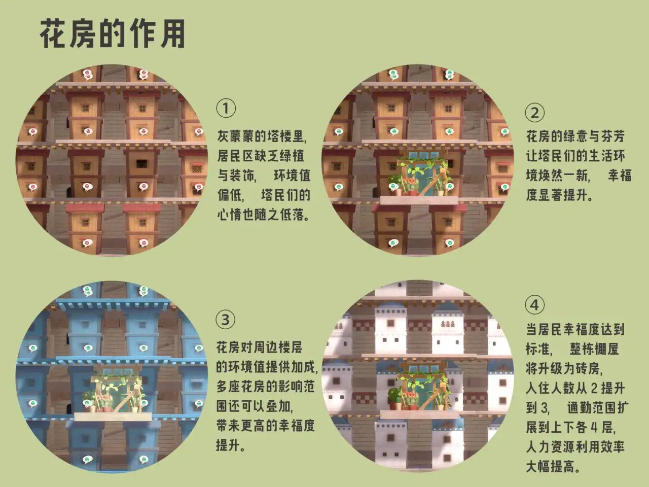 当某位居民的幸福度达到升级标准时,整栋房屋都会从简陋的棚屋升级为坚固的砖房,容纳更多人口(2 → 3),通勤范围也会从上下 2 层拓展到上下 4 层,为塔的建设提供更高效的人力支持。
