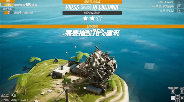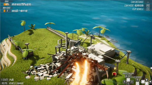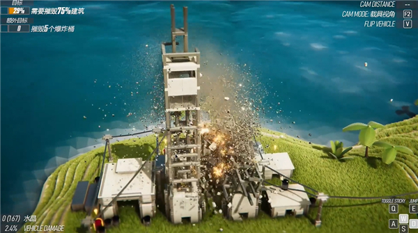 3、根据游戏中的键位进行操控进行破坏,由于游戏采用真实的物理引擎制作,使用不同的载具进行破坏时,也会受到损坏;