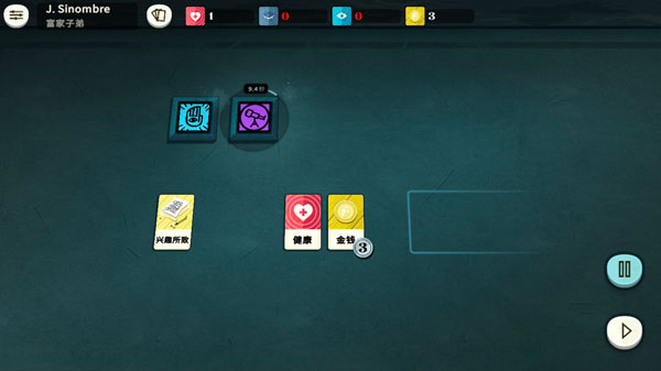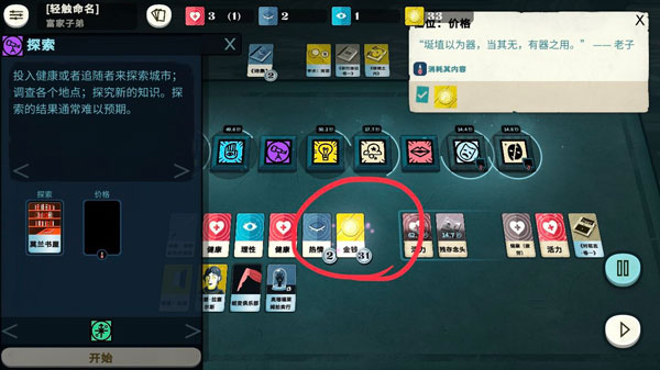 富二代的话,开局会先给工作和调查,其中调查暂不可用,只有工作能放卡牌。通过上述方式,可以发现兴趣所致和健康都可以放在工作里,将这两张卡拖进工作(蓝)里点开始,就能产钱了。