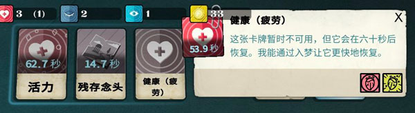 用健康工作后,会发现健康陷入了疲劳,点击健康,右上角会提示还有多久可以恢复。用健康工作还会获得活力,活力牌存在保质期,它可以在桌面上停留3分钟,如果3分钟内没有消耗掉它,它就会消失。