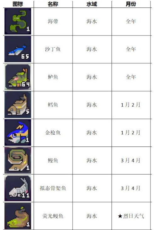补充售价:海带:20,沙丁鱼:30,鲈鱼:65,鳕鱼:170,金枪鱼:400,鳗鱼:155,拟态骨架鱼:195,荧光鳗鱼:300