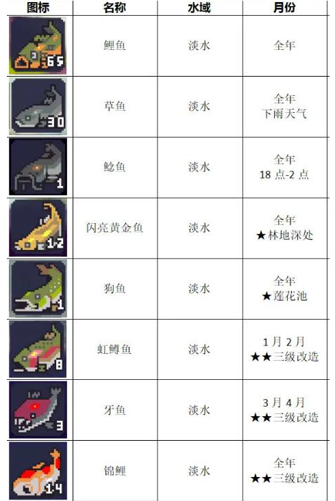 补充售价:鲤鱼:30,草鱼:50,鲶鱼:85,闪亮黄金鱼:1000,狗鱼:175,虹鳟鱼:75,牙鱼:95,锦鲤:105