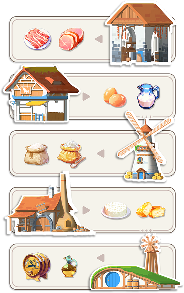 在乳制品工坊中制作芝士,在肉类工坊制作香肠和火腿,在酒窖中酿造红酒,准备好所需食材,就可以按照配方制作招待客人的料理了。