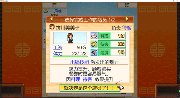 每个店员都有各自的属性加成,在拉面做成的最后一步,系统会询问我们选择哪位店员来完成,这里主要是看店员的上菜速度,对最后的结果其实影响不大,大家不需要太纠结。还有就是我们可以在这里雇佣人手,至于店员的升级,则需要通过、菜单—道具商店,购买技能书来完成,在道具商店中买东西是需要魂点的哦!