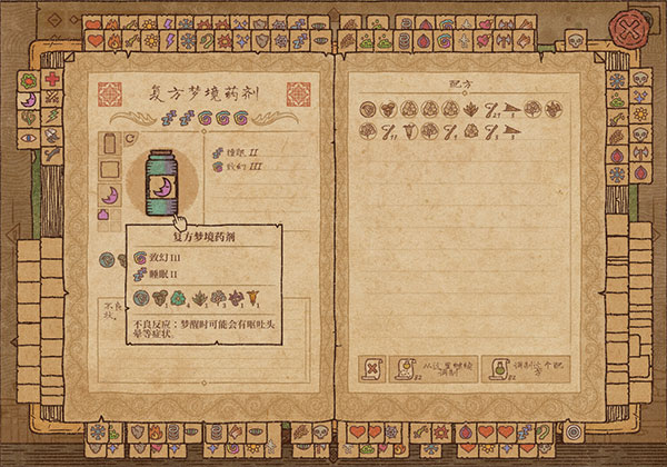 4、复方梦境药剂:致幻III,睡眠II,不良反应为,梦醒时可能会有呕吐头晕等症状。
