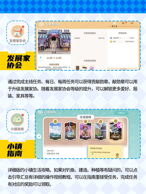 2、【发展家协会】通过完成主线任务、每日、每周任务可以获得贡献勋章,勋章可以用于升级发展家协。随着发展家协会等级的提升,可以解锁更多爱好、服装、家具等等。