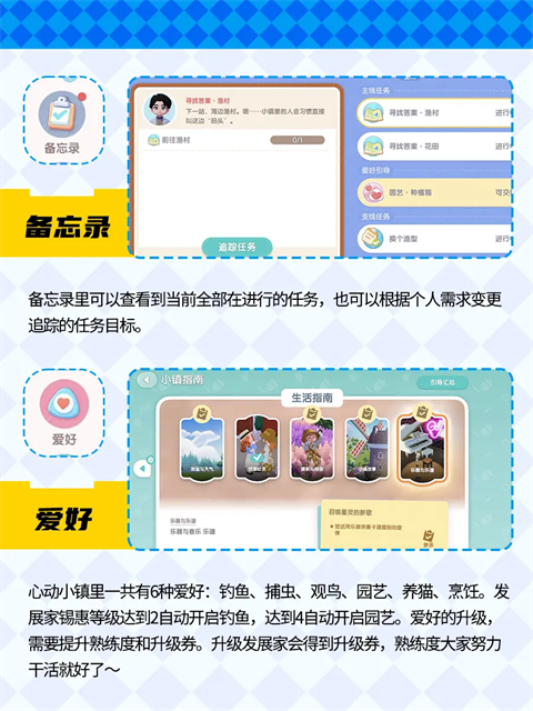 5、【爱好】心动小镇里一共有6种爱好:钓鱼、捕虫、观鸟、园艺、养猫、烹饪。发展家锡惠等级达到2自动开启钓鱼,达到4自动开启园艺。爱好的升级,需要提升熟练度和升级券。升级发展家会得到升级券,熟练度大家努力干活就好了~